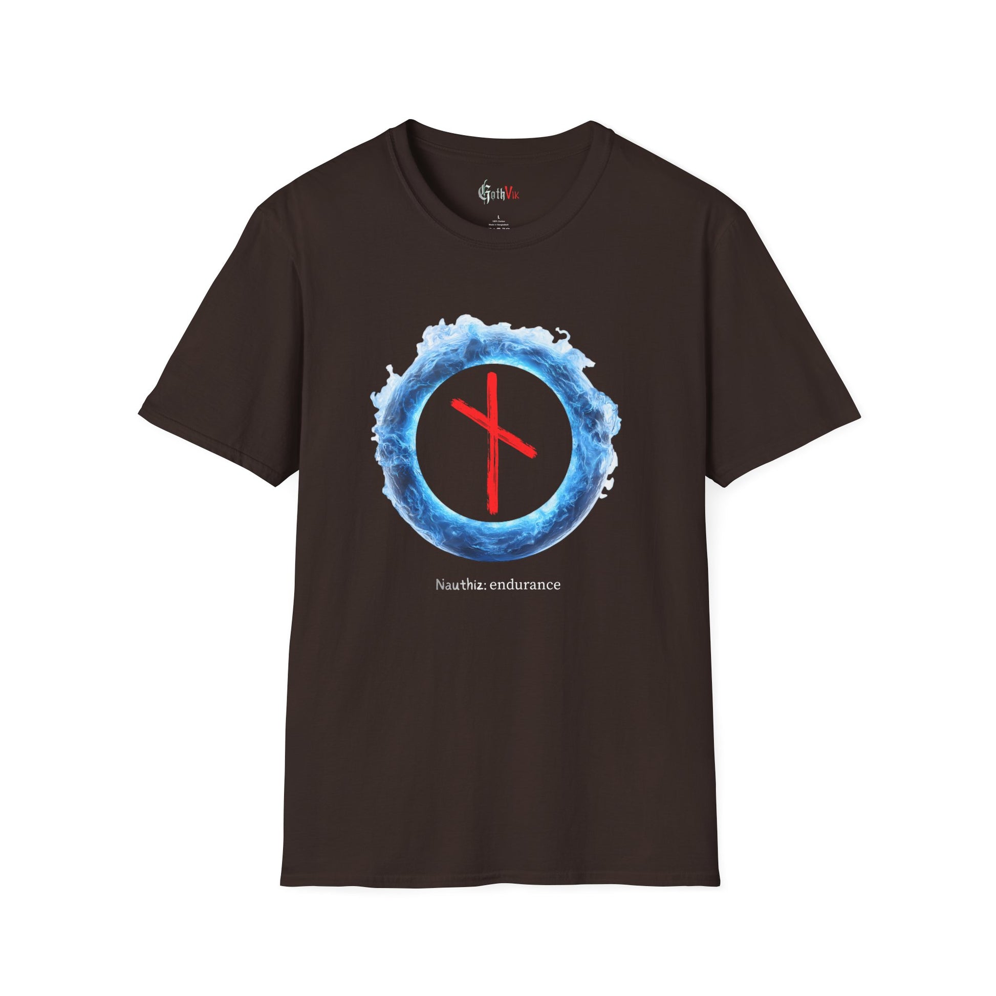 This lightweight crew tee carries a quiet, modern energy — a cool blue ring of flame encircling a bold red rune, with the small inscription “Nauthiz: endurance” beneath. It’s a simple statement piece that reads like a personal talisman: wear it on days you need steadiness, on hikes when the weather turns, or layered under a jacket for evenings by the fire. The fabric is soft and smooth, drapes cleanly, and keeps the print crisp so the emblem remains striking without shouting. It feels lived-in from the first wear and moves easily through everyday routines, while the understated design gives it a thoughtful, intentional edge.