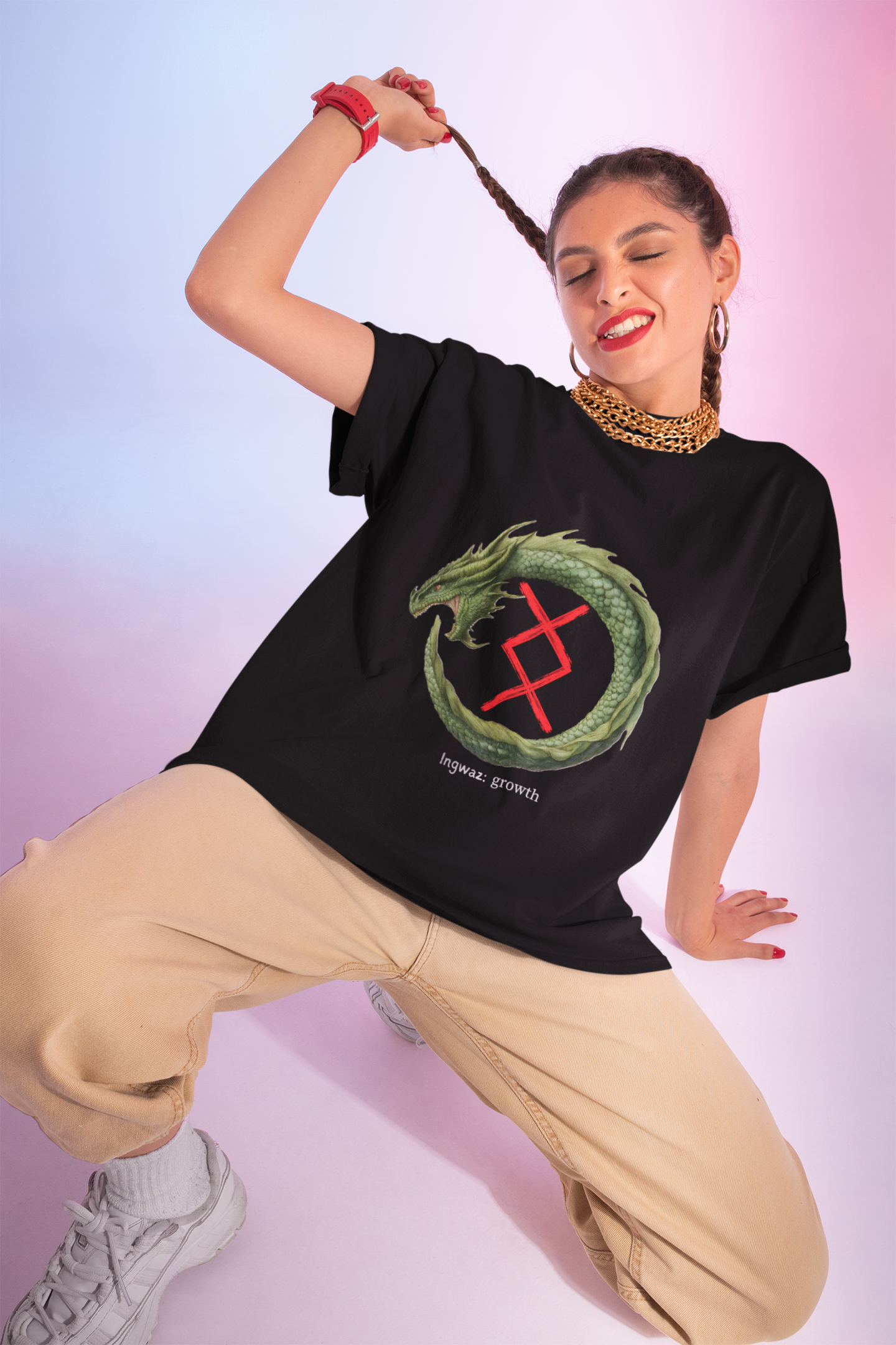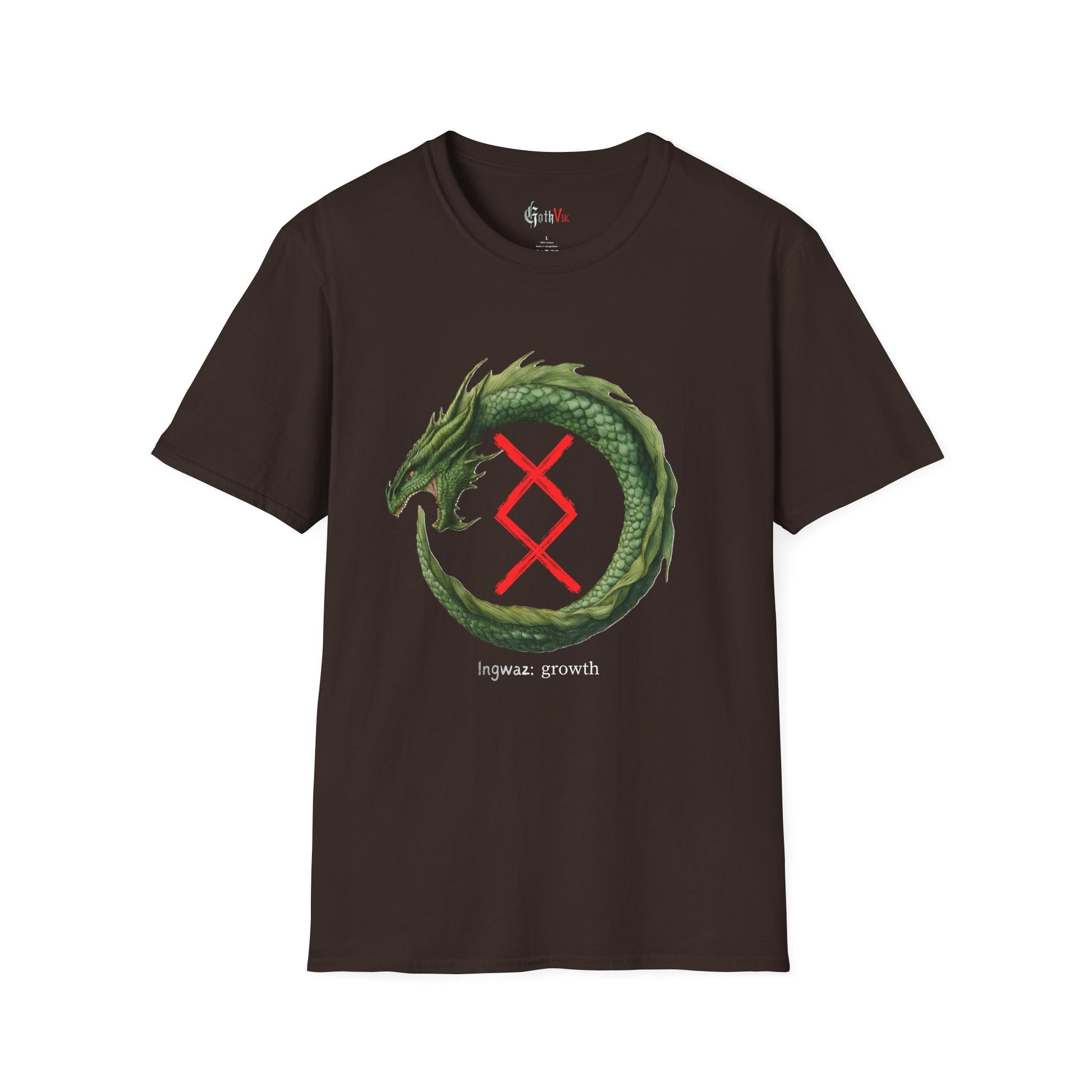 A soft, wearable emblem of quiet strength — this lightweight crew tee pairs a detailed ouroboros dragon with a bold red rune and the small caption “ingwaz · growth.” The smooth, ring-spun cotton feels light against the skin while the classic fit and crew neckline give a clean silhouette that layers easily under jackets or stands alone. Wear it on long walks through mossy trails, at tabletop nights, or during moments when you want a subtle talisman of steady personal progress. The design reads like a conversation piece: mythic, restrained, and rooted in transformation.
