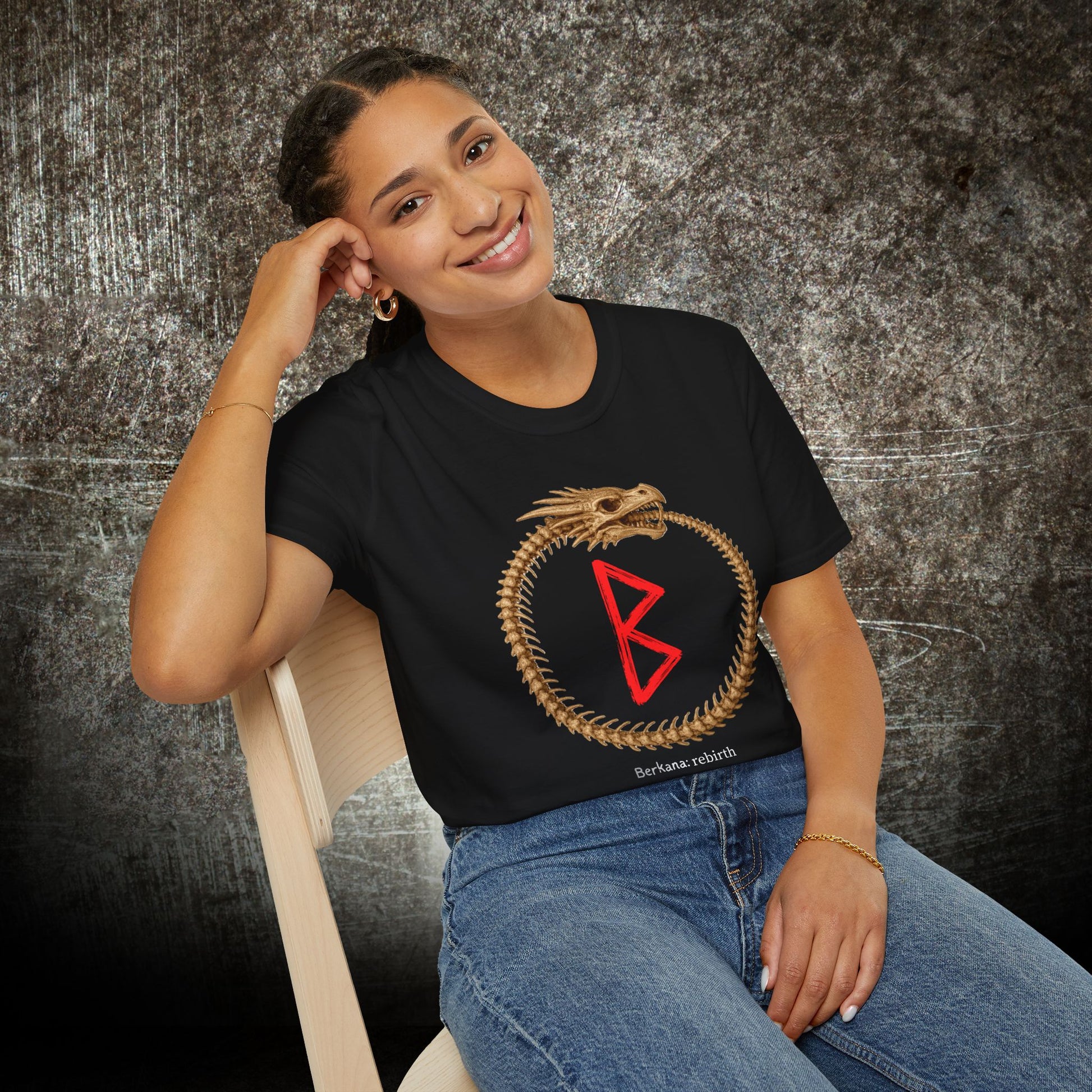 A soft, breathable tee that carries a quiet, mythic edge. The shirt features a central ouroboros, a coiled dragon biting its tail, encircling a bright, rune-like symbol in red hand-painted red Berkana rune meaning "rebirth" to signify growth and a metaphoric symbol of overcoming challenges and growing from those challenges into a new person. A new person who is stronger, more resilient, and reborn with a warrior spirit. The rough edges and brush strokes of the rune are intentionally visible. It feels like something pulled from a modern folk tale: worn on long walks through wind-scoured streets, layered under a coat at dusk, or chosen when you want your look to hint at story and intent. The fabric drapes lightly and prints crisply, so the dragon’s scales and the rune’s hand-drawn energy stay vivid wash after wash. This tee sits comfortably in the wardrobe of someone who collects small, meaningful pieces — the kind of person who notices details and prefers designs that whisper rather than shout.
